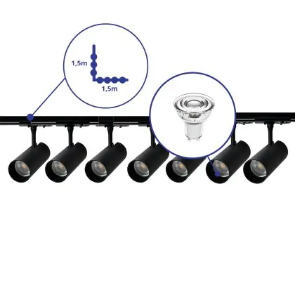 Complete Set 1-Phase Rail L 1,5 x 1,5 Meter Black | incl. 7x Spot + GU10 2700K 3W Dimmable + End Cap, Power Connector and L -Connector