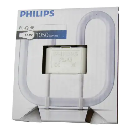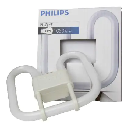 Philips PL-Q 4P are flat 2D type florescent lamps, very energy efficient with a quadrant shape. The PL-Q 4 Pin range is compatible with an electronic ballast. Philips PL-Q 16W 830 4P measure 149 cm and have a GR10q socket type, which corresponds to a socket with 4 pins.